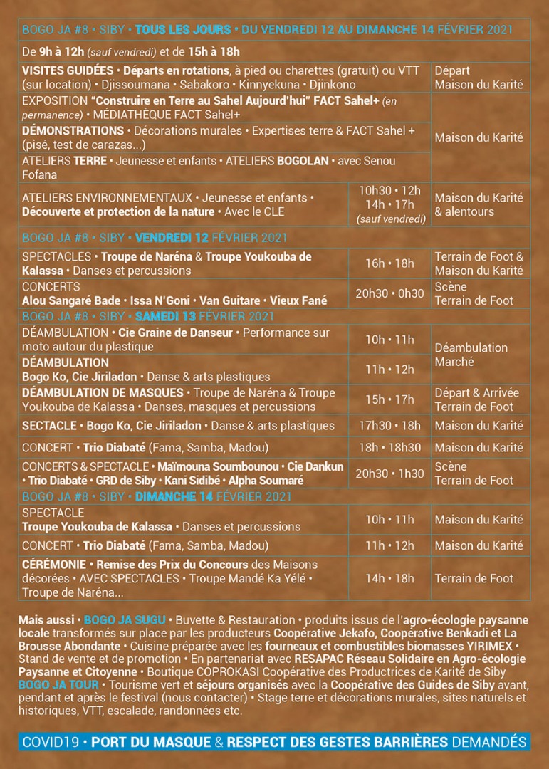 Festival des Maisons Décorées de Siby «BOGO JA» Est un évènement qui met en compétition les femmes pour la décoration des maisons en terre, il se tient chaque année au mois de février.Comme il est de coutume dans le Mandé, la décoration des maisons se fait par les femmes, ce festival est donc le moyen de célébrer ce savoir faire culturel des femmes du Mandé.