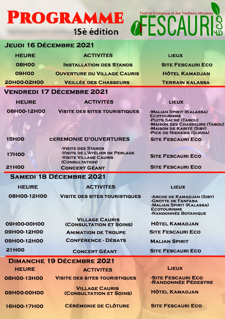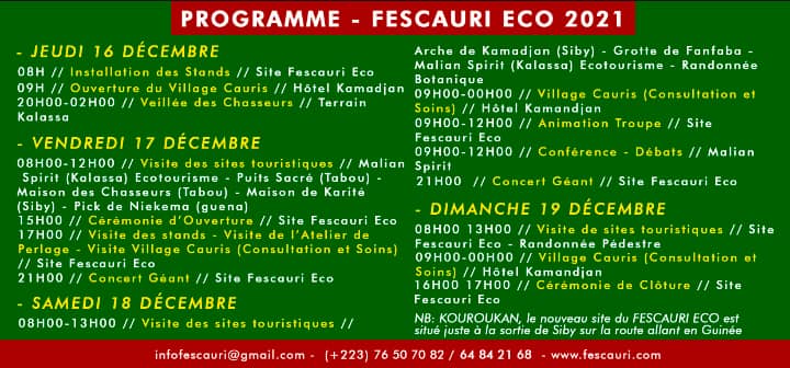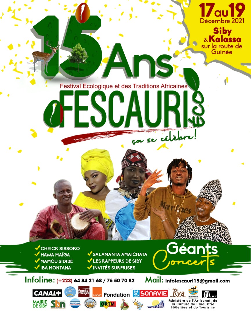 Ce festival aura lieu du 15 au 19 décembre 2021 à Kalassa – Siby, il a pour objectif de contribuer à promouvoir et conserver les arts divinatoires, la médecine traditionnelle, les musiques et danses sacrées d’Afrique et de tisser les liens entre les cultures à travers le monde. Le thème retenu pour cette édition est « Eco citoyenneté et Emplois verts ».